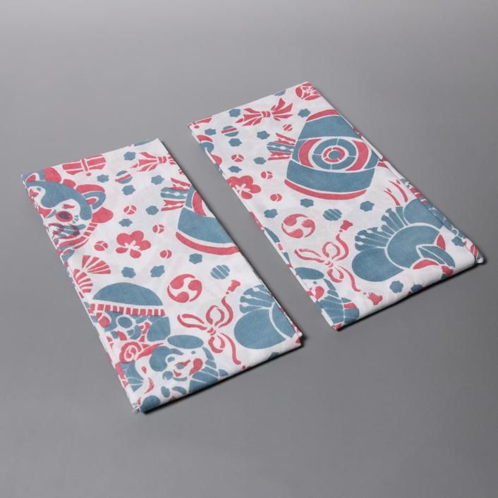 招き猫や打ち出の小槌など、おめでたいモチーフを全面に描いたオリジナルデザインです。普段使いは勿論、お正月のディスプレイなどにも良さそうです。