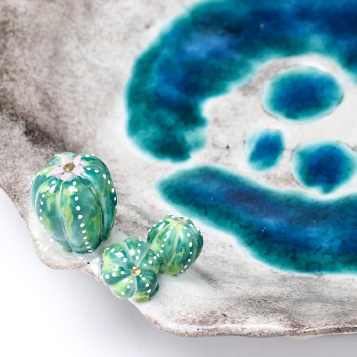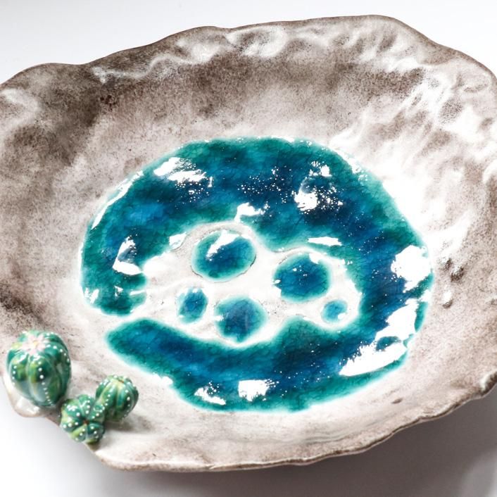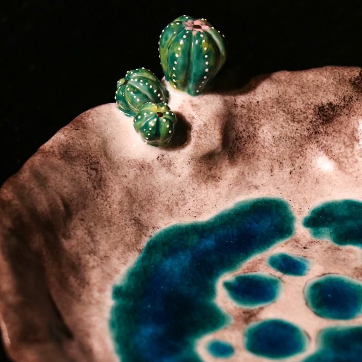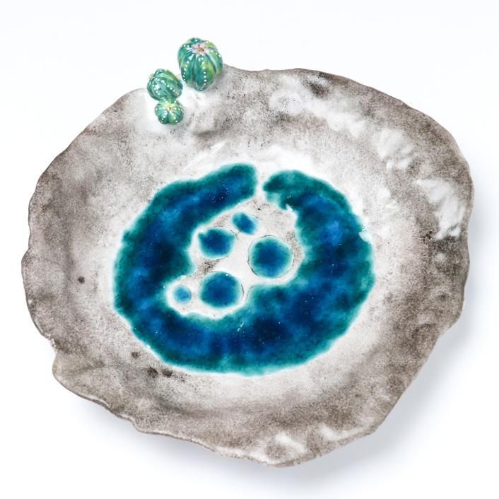 浅瀬の湖と岩場に佇むサボテンがイメージされています。手びねりで制作された岩壁やグラデーションで表現された湖など複雑な表情を見せる九谷焼ならではの彩色が施され、細部にまで作品に対するこだわりが感じられます。