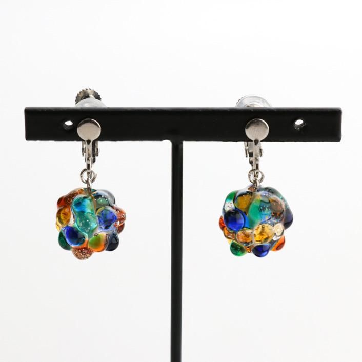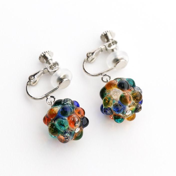 様々な色彩のガラスと銀箔が施された、奥行きのある形が素敵なとんぼ玉のイヤリングです。落ち着きのある上品な仕上がりになっています。金沢市内にある、当店のアトリエで制作いたしました。