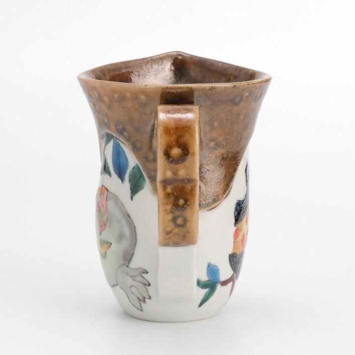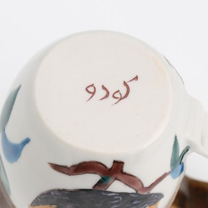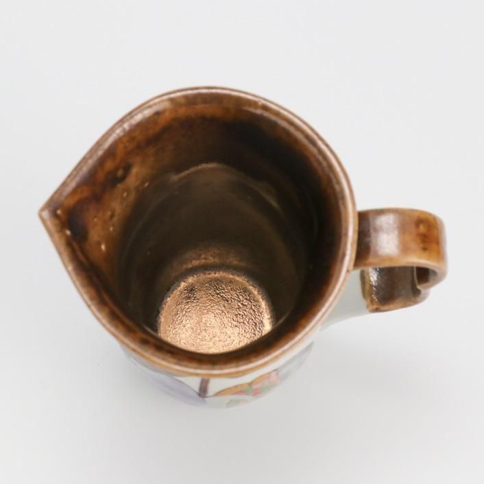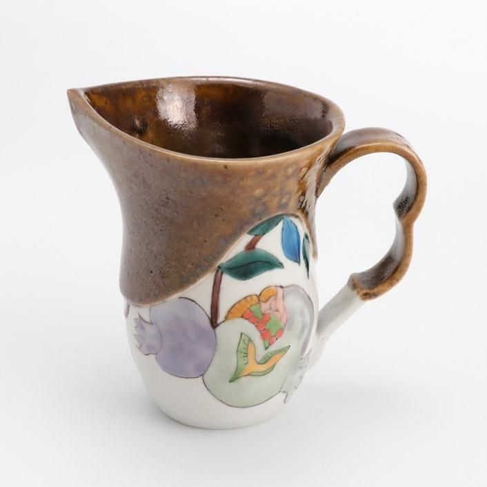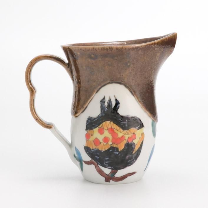持ち手付きの片口は、九谷の和絵具による艶やかな色絵で柘榴(ざくろ)が描かれています。