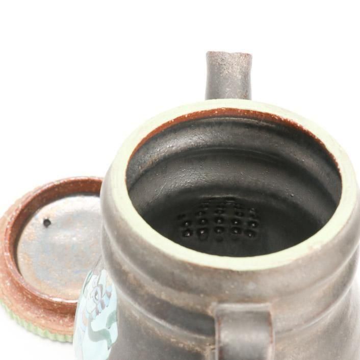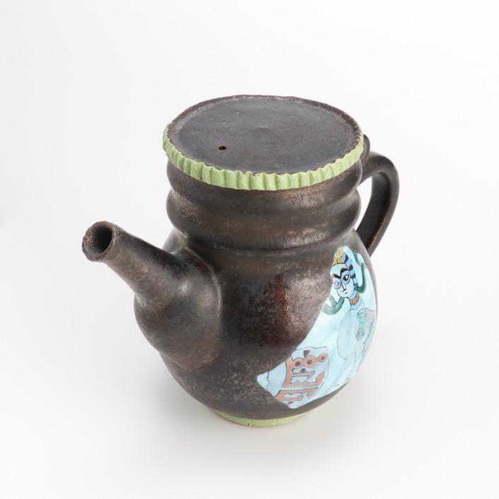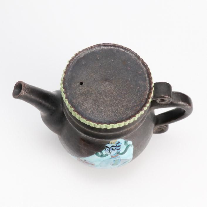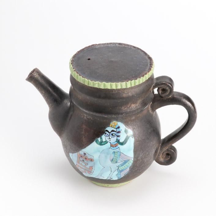 全体覆う金属釉の味わいが美しく、色絵で壁画調のペルシアをイメージした絵が施され、様々な陶芸の技術や技法を熟知した作家による遊び心満点の作品です。