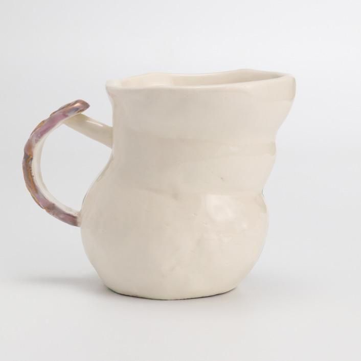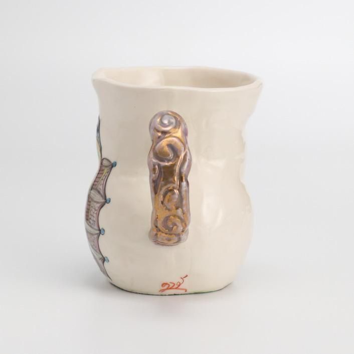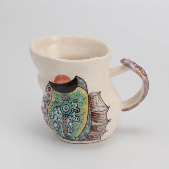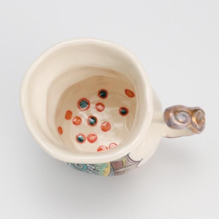 独特のフォルムが個性的などこかエキゾチックなマグカップは、工藤さんが独自に配合したオリジナルの絵具を使って彩色しています。