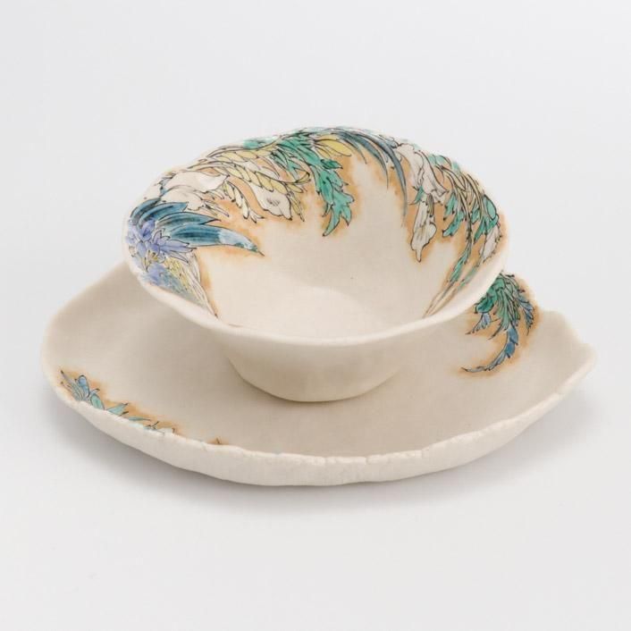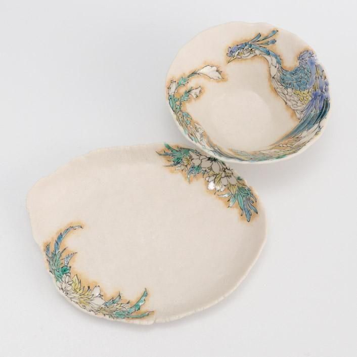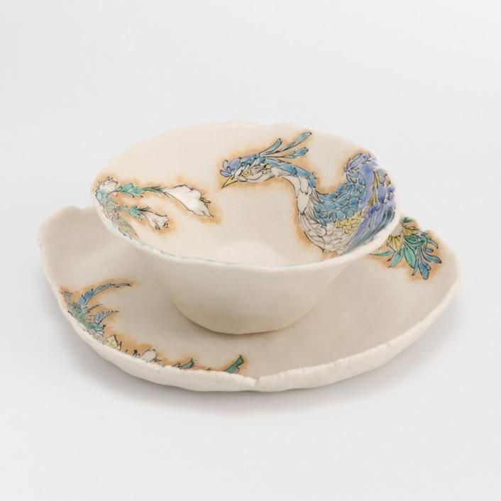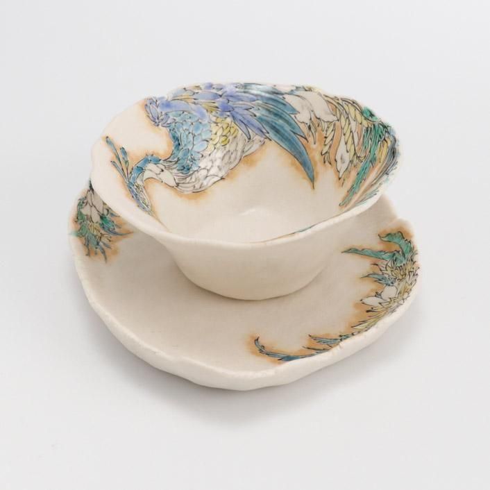 磁器や半磁器、九谷の色絵の具を艶やかに使用された花鳥シリーズの碗皿です。