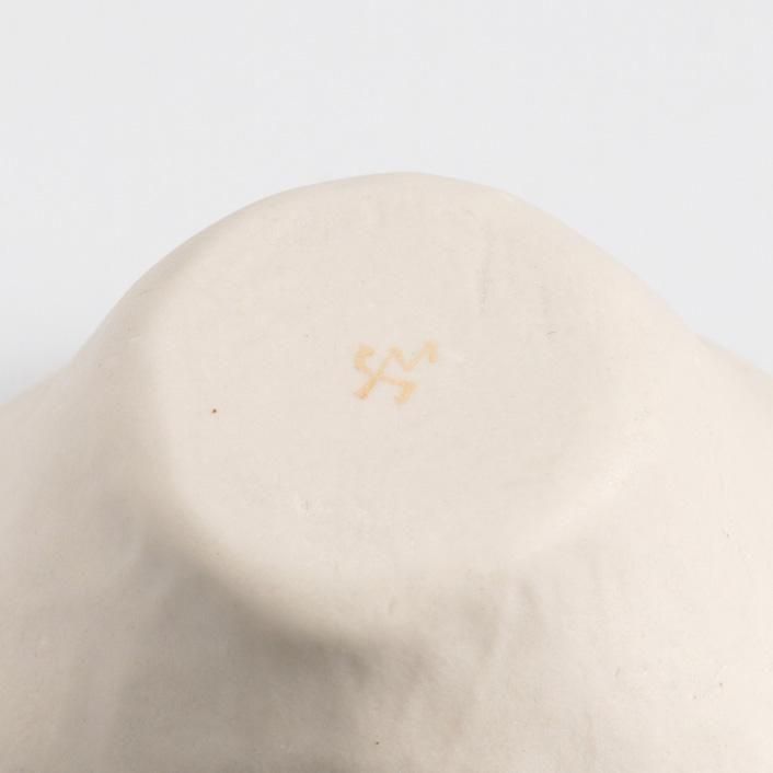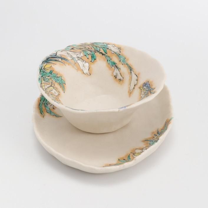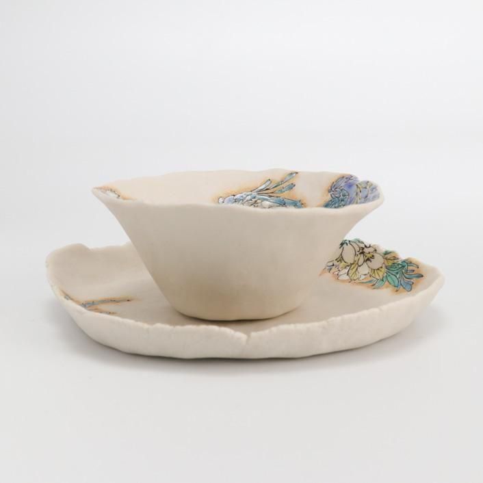 土を削り出して作られた形と、花と鳥が融合した花鳥の絵付けが魅力的な作品です。