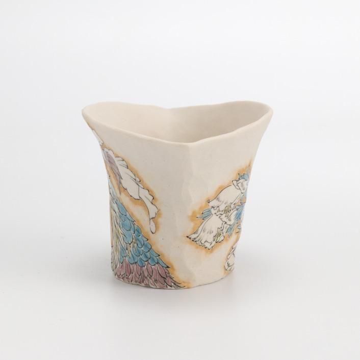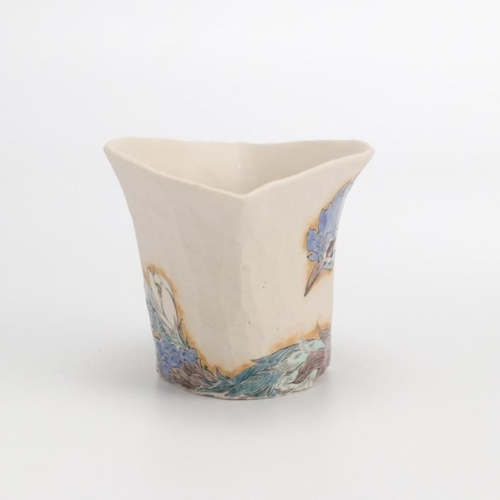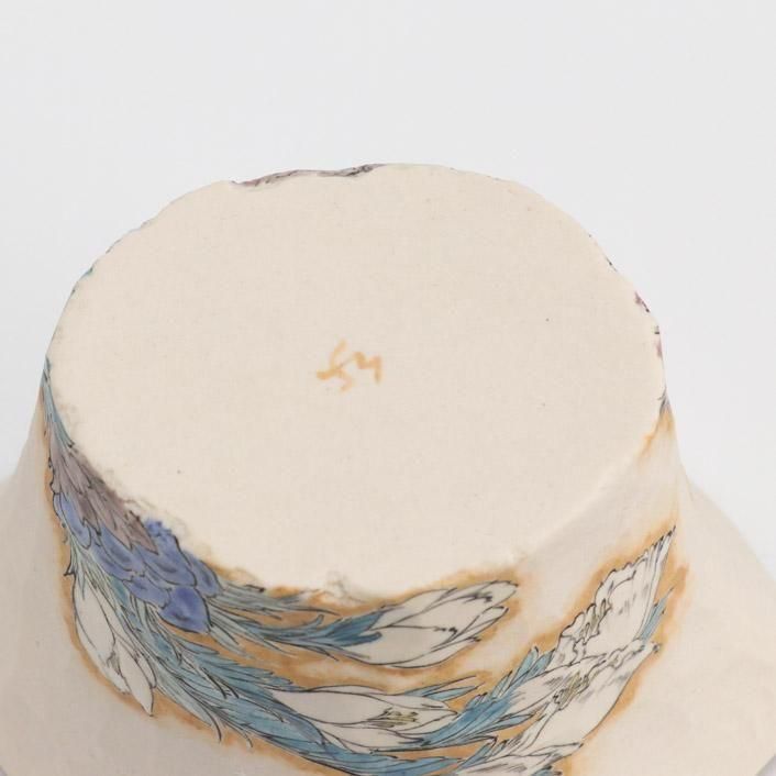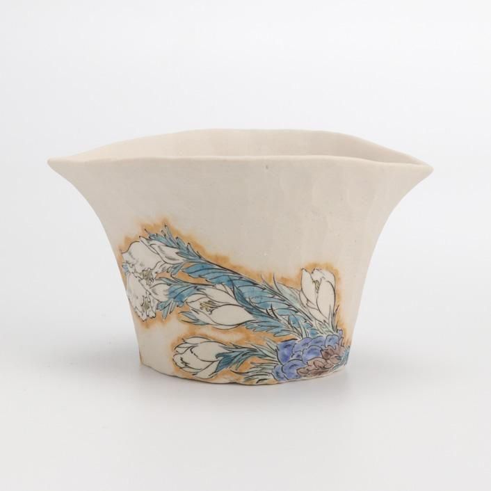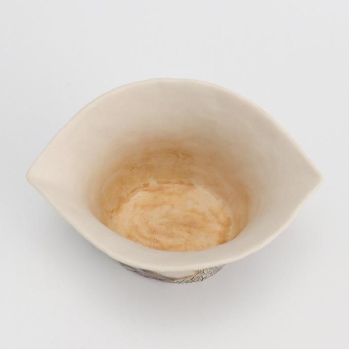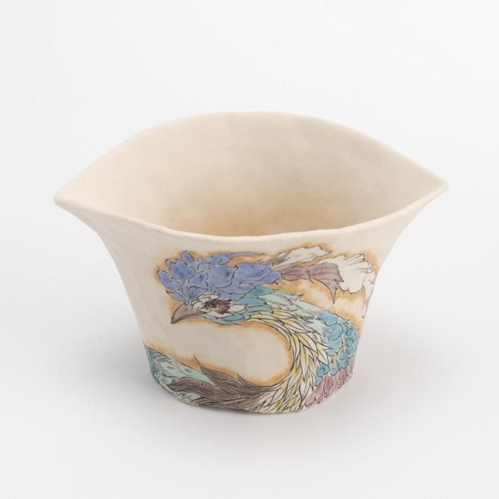 土を削り出して作られた形と、花と鳥が融合した花鳥の絵付けが魅力的な作品です。