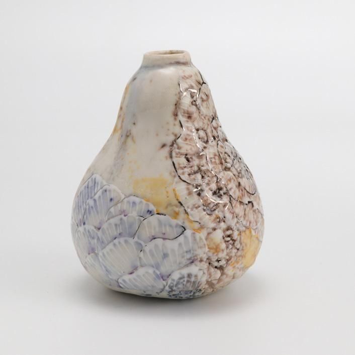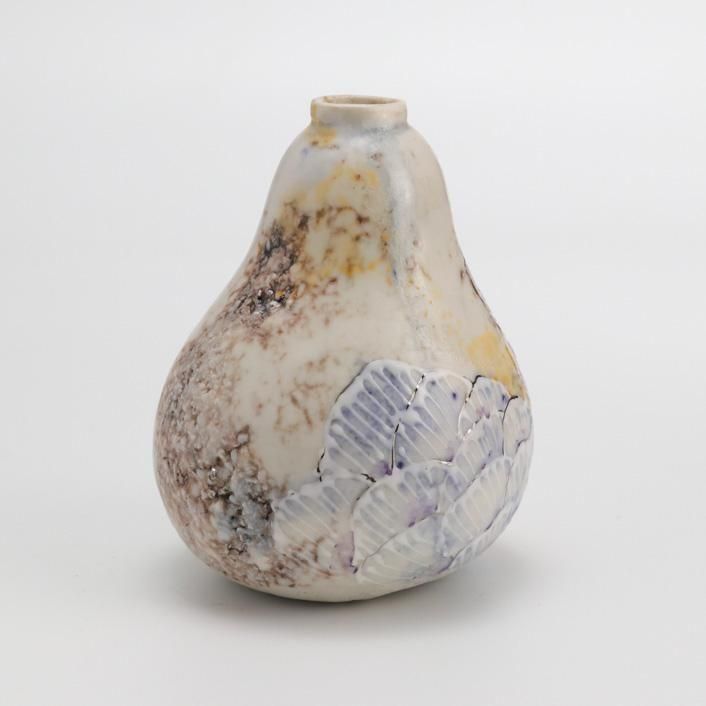 九谷焼の素地に粘土を混ぜ、土の表情を残した生地に上絵を施した花器です。